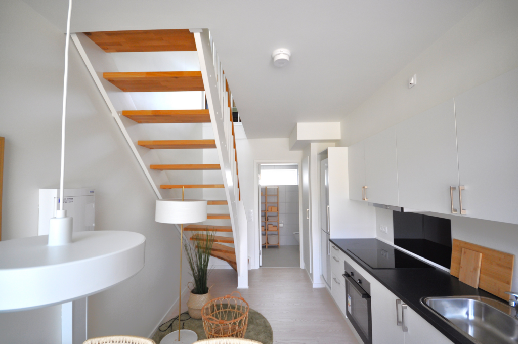 Det særlige ved de tre bygninger er, at de alle bliver opbygget i trækassetter, som giver en høj styrkeegenskab samt enklere og hurtigere montering / opbygning. Det samlede byggeareal tæller til i alt 920 m2. Hver enkel lejlighed er på i alt ca. 38 kvadratmeter fordelt i to etager med køkken/alrum og badeværelse i stuen samt stue og soveværelse på 1. salen