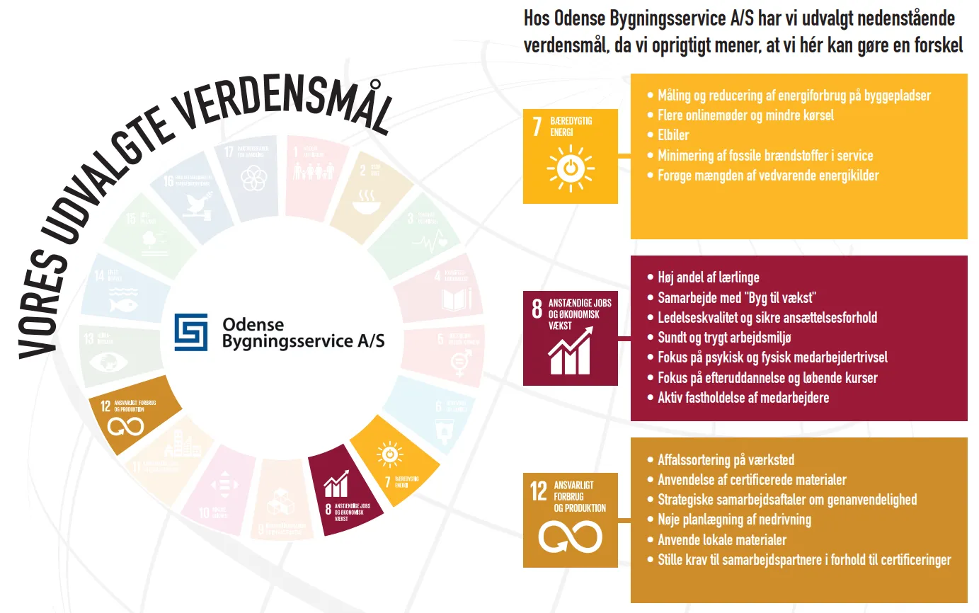 Strategien for bæredygtighed tager udgangspunkt i FN’s verdensmål. Vi har udvalgt 3 verdensmål, hvor vi som service- og entreprisevirksomhed mener, at vi oprigtigt kan gøre en forskel.