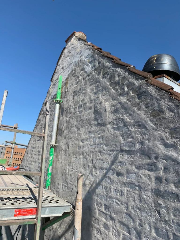 Opgaven bestod i at nedtage to gavle i en 5-etagers højde, som var ved at vælte ned over nabobygningerne. Efter nedbrydningen af gavlen blev den genopført samt renoveret med ny-muret gavlspids, nye tagsten på brandskel med zinkindskud. Tilmed blev der monteret en ny ventilationsskorsten. Af tømrerarbejde har vi udskiftet rådne spær samt etableret nye forankringer til afstivelse af gavlen. Som hovedentreprenør har Odense Bygningsservice koordineret med resterende faggruper, herunder VVS, blikkenslager, stillads m.m.